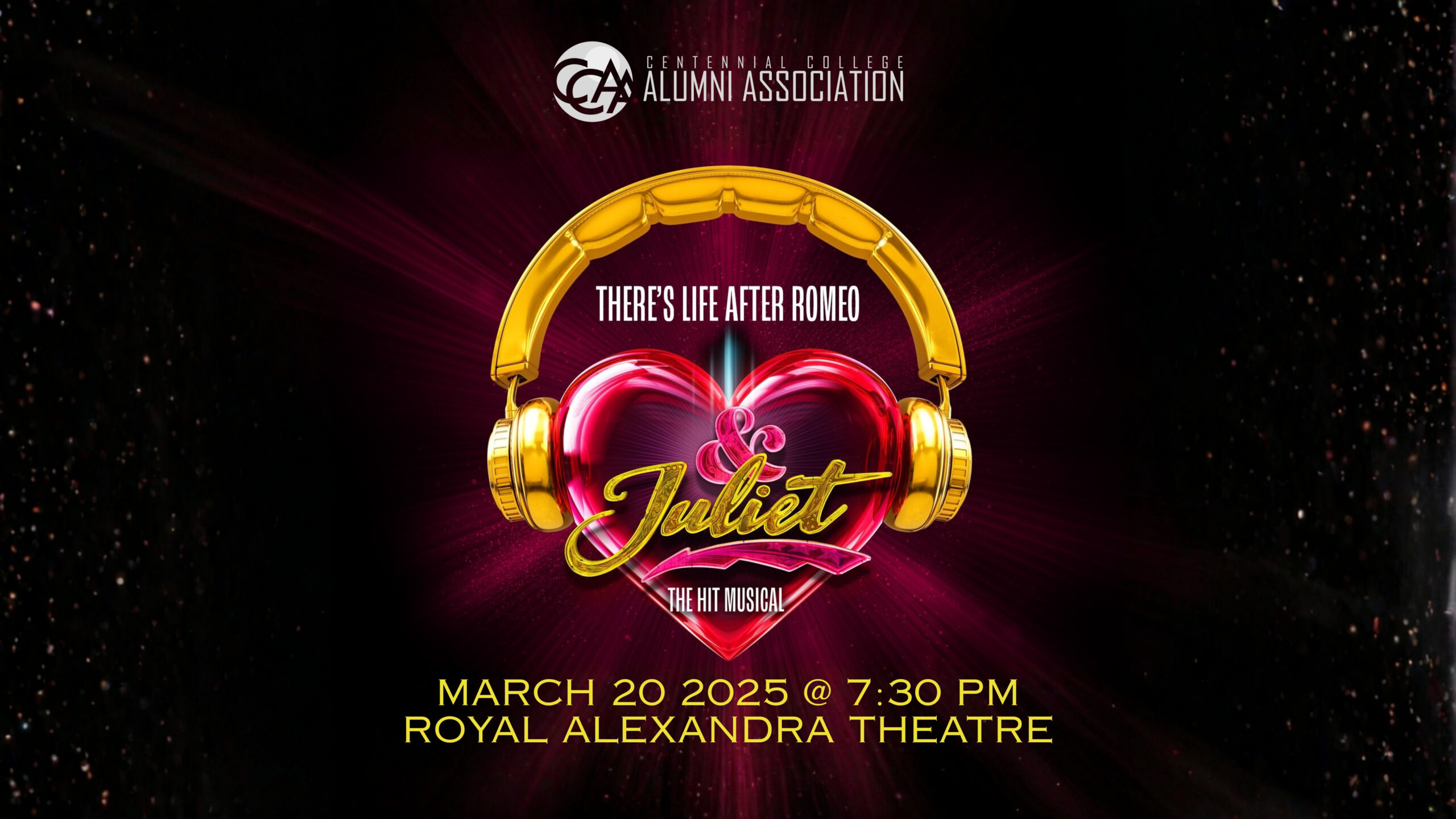 The Centennial College Alumni Association (CCAA) is heading to one of Broadway’s most fun, fearless, and feel-good musicals — and you’re invited to join us! Come with your CCAA Family for a high-energy night of music, laughter, and pop anthems at & Juliet, the smash-hit musical that flips the script on Shakespeare’s greatest love story.